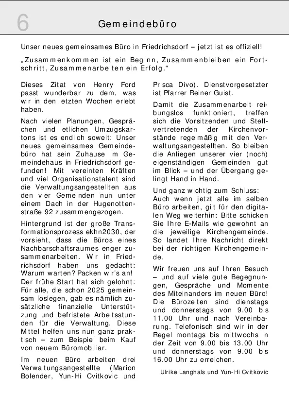 Das Gemeindebüro ist geöffnet DI und DO, jeweils 9:00 -11:00 Uhr und nachVereinbarung.